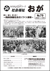 社会福祉 おが 最新号 社会福祉 おが 令和8年1月1日号 No.79 歌い、踊り、笑つた! ~高齢者健康生きがいづくり事業~ 新年あけましておめでとうございます。 今年度も、高齢者健康生きがいづくり事業(ふれあい・いきいきサロン)を9地区で開催いたしました。 午前中は体操を交えながらの講話で頭と体を動かし、楽しく昼食をとった後、参加された皆さんは出演者と一緒に歌い、踊り、アトラクションを満喫しました。